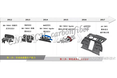 2012年以来,奥迪汽车在CFRP应用领域逐渐轻车熟路,2017年CFRP在奥迪A8汽车上实现一体化应用,关键技术发展流程如下图所示。